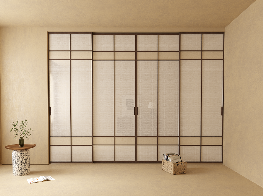 ZMKM深諳此道,為這扇門搭配了獨特的樟子玻璃。它絕非普通的白玻璃,其表面帶有如宣紙般的絲質紋理,光線透過時,被溫柔地過濾,形成均勻柔和的漫射光,恰似透過窗紙的光影效果。玻璃上還點綴著與邊框同色系的纖細格柵線條,似有若無,增添了一份別樣美感。