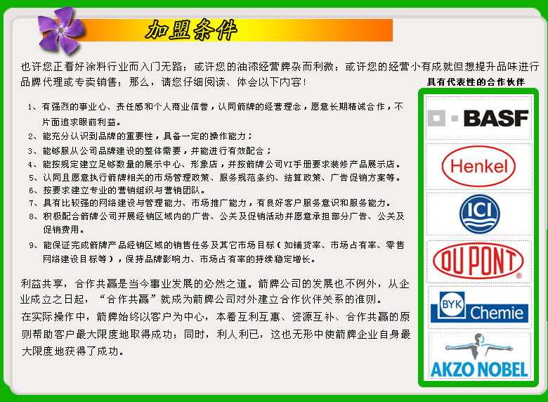 在日趨激烈的全球化競爭中,箭牌涂料始終堅(jiān)持開拓創(chuàng)新、積極聯(lián)合、利益共享的發(fā)展戰(zhàn)略,與國際化工巨頭強(qiáng)強(qiáng)合作,充分利用各自在技術(shù)、管理、資源方面的優(yōu)勢,努力進(jìn)行新產(chǎn)品、新材料、新技術(shù)的研究與開發(fā),不斷推出物超所值的產(chǎn)品和服務(wù),滿足各種客戶持續(xù)發(fā)展的需求,推動(dòng)全球化工涂料行業(yè)的不斷進(jìn)步與發(fā)展!